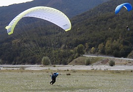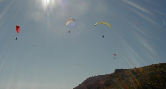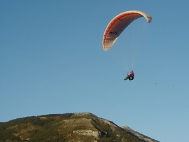 Utöver sydstarten har Lachens en väststart (skymtar på bilden) och en på nord. Det finns en officiell landning nedanför varje start, och dessutom en stor landning vid skärmflygskolan nedanför byn La Roque Esclapon. Så här på sensommaren är ofta utsikten kring Lachens något extra: I söder ser man det blåa medelhavet, norrut breder alperna ut sig med snö på topparna och nedaför fötterna har man en grön vacker dalgång med ett par pittoreska byar och gott om fält. |