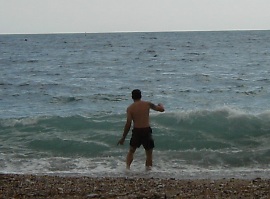 Men trots att almanackan säger höst är det fortfarande varmt nog att ta ett dopp i havet Ibland går det inte att flyga t.ex. på grund av att vinden är för kraftig i bergen. Men då är det ofta ändå varmt och skönt nere vid kusten. En av dagarna chansade vi och for till Monaco, där kan det ofta gå att flyga i sjöbrisen trots att det blåser nord och annat uppe i bergen. Men den här gången funkade inte heller det. Så vi kände oss tvugna att bada istället. Livet är hårt. |