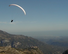 Men har man bara väl kommit ut i luften så finns det ofta fin termik att flyga på. Dagen då vi var där såg vi folk flyga iväg bra långt bort (H-P försökte också) och sedan komma tillbaka och topplanda (det gjorde inte H-P ...). Och utsikten är inte den sämsta: Lilla vackra Gourdon ligger på sin klippa en bit nedanför (syns på bilden) och ute vid kusten ser man Nice. Och förstås Medelhavet. |