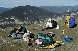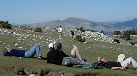 Ett annat fint flygställe är Lachens. Om Gourdon ser oansenligt ut är Lachens desto mäktigare: Ett stort, högt berg med starter i tre vädersträck. Gräsängarna bakom starten räcker att packa upp en och annan skärm på. Eller träna golfsvingen på som Håkan och H-P gör på bilden. Vi andra valde att spara energi istället. |