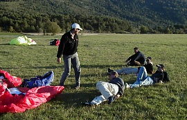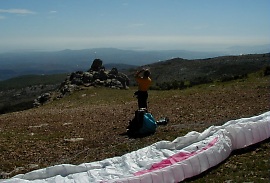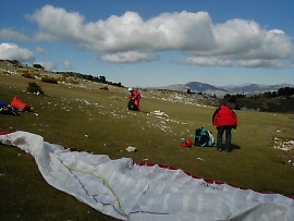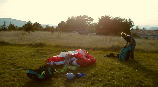 Men efter en stund började molnen poppa upp och lättjan ersattes av hårt arbete: det var dags att ta fram skärm och grejer. Lachens är ett av de ställen där man ofta kommer i kontakt med andra friflygare, både vingar och segelkärror. Segelflygarna går ofta till just Lachens för att tanka höjd, det är ett säkert termikställe. |